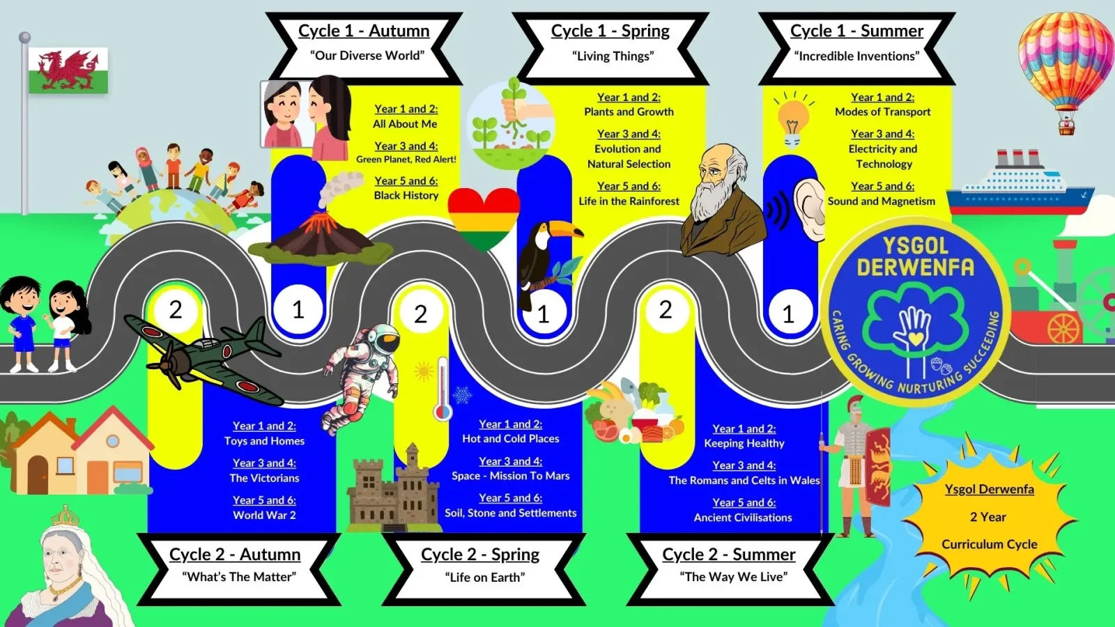 At Ysgol Derwenfa we have created our Vision Document collaboratively. Staff have all had a input in all aspects of the curriculum to reflect our processes and methods of planning, teaching and assessment. Please click the picture below to have a look through our document, we are very proud of it!